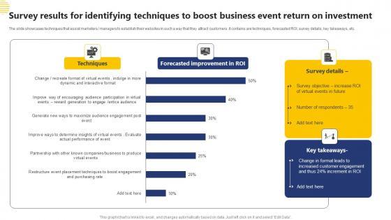 The slide showcases techniques that assist marketers managers to establish their websites in such a way that they attract customers .It contains are techniques, forecasted ROI, survey details, key takeaways, etc. Pitch your topic with ease and precision using this Survey Results For Identifying Techniques To Boost Business Event Return On Investment Introduction Pdf This layout presents information on Survey Results, Identifying Techniques, Business Event It is also available for immediate download and adjustment. So, changes can be made in the color, design, graphics or any other component to create a unique layout. The slide showcases techniques that assist marketers managers to establish their websites in such a way that they attract customers .It contains are techniques, forecasted ROI, survey details, key takeaways, etc.