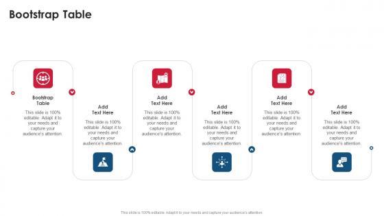 Introducing our well-designed Bootstrap Table In Powerpoint And Google Slides Cpb. This PowerPoint design presents information on topics like Bootstrap Table. As it is predesigned it helps boost your confidence level. It also makes you a better presenter because of its high-quality content and graphics. This PPT layout can be downloaded and used in different formats like PDF, PNG, and JPG. Not only this, it is available in both Standard Screen and Widescreen aspect ratios for your convenience. Therefore, click on the download button now to persuade and impress your audience. Our Bootstrap Table In Powerpoint And Google Slides Cpb are topically designed to provide an attractive backdrop to any subject. Use them to look like a presentation pro.
