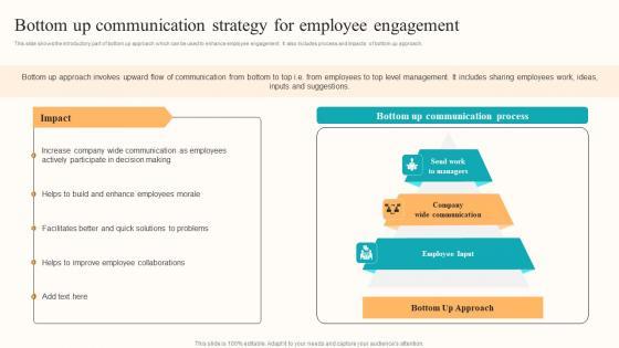 This slide shows the introductory part of bottom up approach which can be used to enhance employee engagement. It also includes process and impacts of bottom up approach. Want to ace your presentation in front of a live audience Our Bottom Up Communication Strategy For Employee Plan To Develop Ppt Template can help you do that by engaging all the users towards you. Slidegeeks experts have put their efforts and expertise into creating these impeccable powerpoint presentations so that you can communicate your ideas clearly. Moreover, all the templates are customizable, and easy-to-edit and downloadable. Use these for both personal and commercial use. This slide shows the introductory part of bottom up approach which can be used to enhance employee engagement. It also includes process and impacts of bottom up approach.