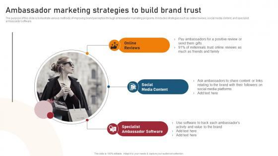 The purpose of this slide is to illustrate various methods of improving brand perception through ambassador marketing programs. It includes strategies such as online reviews, social media content, and specialist ambassador software. Slidegeeks is one of the best resources for PowerPoint templates. You can download easily and regulate Ambassador Marketing Strategies Techniques For Generating Brand Awareness Download Pdf for your personal presentations from our wonderful collection. A few clicks is all it takes to discover and get the most relevant and appropriate templates. Use our Templates to add a unique zing and appeal to your presentation and meetings. All the slides are easy to edit and you can use them even for advertisement purposes. The purpose of this slide is to illustrate various methods of improving brand perception through ambassador marketing programs. It includes strategies such as online reviews, social media content, and specialist ambassador software.