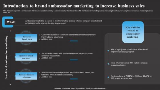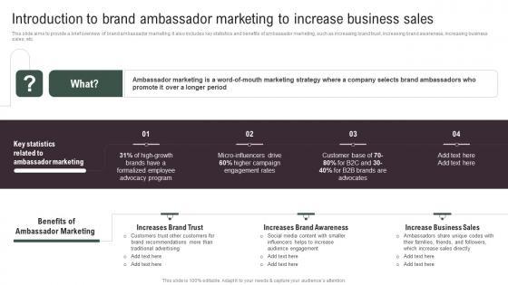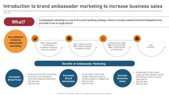 This slide aims to provide a brief overview of brand ambassador marketing. It also includes key statistics and benefits of ambassador marketing, such as increasing brand trust, increasing brand awareness, increasing business sales, etc. Make sure to capture your audiences attention in your business displays with our gratis customizable Introduction To Brand Ambassador Techniques For Generating Brand Awareness Graphics Pdf. These are great for business strategies, office conferences, capital raising or task suggestions. If you desire to acquire more customers for your tech business and ensure they stay satisfied, create your own sales presentation with these plain slides. This slide aims to provide a brief overview of brand ambassador marketing. It also includes key statistics and benefits of ambassador marketing, such as increasing brand trust, increasing brand awareness, increasing business sales, etc.