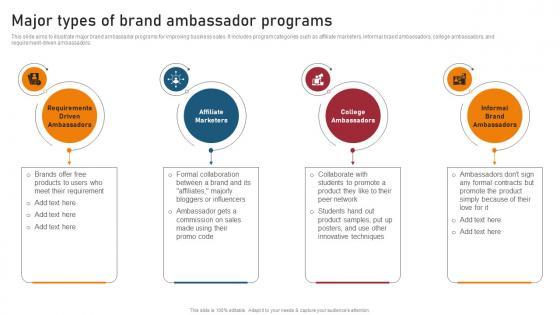 This slide aims to illustrate major brand ambassador programs for improving business sales. It includes program categories such as affiliate marketers, informal brand ambassadors, college ambassadors, and requirement driven ambassadors. Retrieve professionally designed Major Types Of Brand Ambassador Programs Tracking Word Mouth Marketing Download PDF to effectively convey your message and captivate your listeners. Save time by selecting pre-made slideshows that are appropriate for various topics, from business to educational purposes. These themes come in many different styles, from creative to corporate, and all of them are easily adjustable and can be edited quickly. Access them as PowerPoint templates or as Google Slides themes. You do not have to go on a hunt for the perfect presentation because Slidegeeks got you covered from everywhere. This slide aims to illustrate major brand ambassador programs for improving business sales. It includes program categories such as affiliate marketers, informal brand ambassadors, college ambassadors, and requirement driven ambassadors.