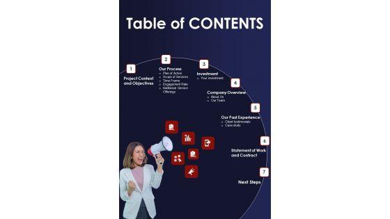 Presenting you an exemplary Table Of Contents Enterprise Brand Ambassador Enlisting Proposal One Pager Sample Example Document. Our one-pager comprises all the must-have essentials of an inclusive document. You can edit it with ease, as its layout is completely editable. With such freedom, you can tweak its design and other elements to your requirements. Download this Table Of Contents Enterprise Brand Ambassador Enlisting Proposal One Pager Sample Example Document brilliant piece now. Our Table Of Contents Enterprise Brand Ambassador Enlisting Proposal One Pager Sample Example Document are topically designed to provide an attractive backdrop to any subject. Use them to look like a presentation pro.