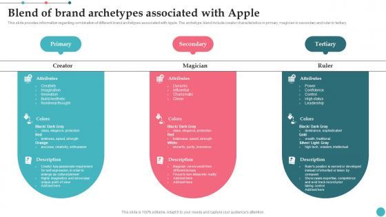 This slide provides information regarding combination of different brand archetypes associated with Apple. The archetype blend include creator characteristics in primary, magician in secondary and ruler in tertiary. If your project calls for a presentation, then Slidegeeks is your go to partner because we have professionally designed, easy to edit templates that are perfect for any presentation. After downloading, you can easily edit Blend Brand Archetypes Associated Apple Brand Story Journey Of Iconic Enterprise Background Pdf and make the changes accordingly. You can rearrange slides or fill them with different images. Check out all the handy templates This slide provides information regarding combination of different brand archetypes associated with Apple. The archetype blend include creator characteristics in primary, magician in secondary and ruler in tertiary.