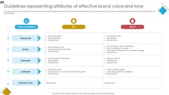 This slide covers key characteristics of brand voice and tone based on general guidelines. It includes characteristics such as being passionate, quirky, irreverent, authentic along with several dos and donts that are to be considered. Are you searching for a Blueprint For Effective Real Guidelines Representing Attributes Of Effective Brand Voice Strategy SS V that is uncluttered, straightforward, and original Its easy to edit, and you can change the colors to suit your personal or business branding. For a presentation that expresses how much effort you have put in, this template is ideal With all of its features, including tables, diagrams, statistics, and lists, its perfect for a business plan presentation. Make your ideas more appealing with these professional slides. Download Blueprint For Effective Real Guidelines Representing Attributes Of Effective Brand Voice Strategy SS V from Slidegeeks today. This slide covers key characteristics of brand voice and tone based on general guidelines. It includes characteristics such as being passionate, quirky, irreverent, authentic along with several dos and donts that are to be considered.