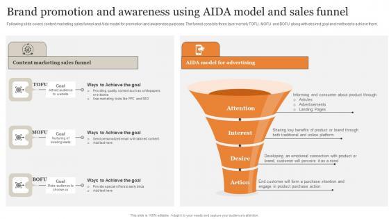 Following slide covers content marketing sales funnel and Aida model for promotion and awareness purposes. The funnel consists three layer namely TOFU, MOFU and BOFU along with desired goal and methods to achieve them. Crafting an eye-catching presentation has never been more straightforward. Let your presentation shine with this tasteful yet straightforward Brand Promotion And Awareness Using Aida Model Ultimate Guide Implementing Microsoft Pdf template. It offers a minimalistic and classy look that is great for making a statement. The colors have been employed intelligently to add a bit of playfulness while still remaining professional. Construct the ideal Brand Promotion And Awareness Using Aida Model Ultimate Guide Implementing Microsoft Pdf that effortlessly grabs the attention of your audience. Begin now and be certain to wow your customers. Following slide covers content marketing sales funnel and Aida model for promotion and awareness purposes. The funnel consists three layer namely TOFU, MOFU and BOFU along with desired goal and methods to achieve them.