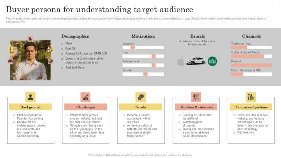 This slide showcases buyers persona of target audience towards whom storytelling marketing efforts would be directed. It takes into account background, challenges faced, goals, hobbies and interests, demographics, common objections and fears. Create an editable Creating Content Marketing Technique For Brand Promotions Buyers Persona Of Target Audience Identified Brochure PDF that communicates your idea and engages your audience. Whether you are presenting a business or an educational presentation, pre-designed presentation templates help save time. Creating Content Marketing Technique For Brand Promotions Buyers Persona Of Target Audience Identified Brochure PDF is highly customizable and very easy to edit, covering many different styles from creative to business presentations. Slidegeeks has creative team members who have crafted amazing templates. So, go and get them without any delay.