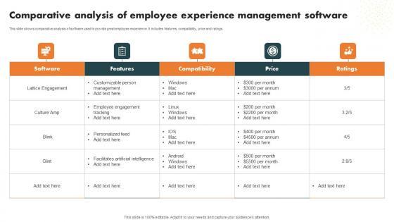 This slide shows comparative analysis of software used to provide great employee experience. It includes features, compatibility, price and ratings. There are so many reasons you need a Internal Promotion Strategy To Enhance Brand Awareness Comparative Analysis Employee Experience Introduction PDF. The first reason is you cannot spend time making everything from scratch, Thus, Slidegeeks has made presentation templates for you too. You can easily download these templates from our website easily.