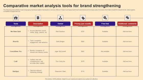 The following slide exhibits means of gauging market perception of products or services offered. It helps businesses build brand awareness and increase sales. It includes information related to industry trends, data supplier, competitor engagement, etc.Pitch your topic with ease and precision using this Comparative Market Analysis Tools For Brand Strengthening Infographics Pdf This layout presents information on Engagement Audience, Accurate Data Supplier, Track Competitor It is also available for immediate download and adjustment. So, changes can be made in the color, design, graphics or any other component to create a unique layout. The following slide exhibits means of gauging market perception of products or services offered. It helps businesses build brand awareness and increase sales. It includes information related to industry trends, data supplier, competitor engagement, etc.