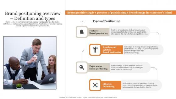 Mentioned slide highlights information about brand positioning. It includes definition as well as various types of positioning. Positioning covered are feature based, experience based, lifestyle based etc. Welcome to our selection of the Tactical Brand Extension Launching Brand Positioning Overview Definition And Types Mockup PDF. These are designed to help you showcase your creativity and bring your sphere to life. Planning and Innovation are essential for any business that is just starting out. This collection contains the designs that you need for your everyday presentations. All of our PowerPoints are 100 percent editable, so you can customize them to suit your needs. This multi-purpose template can be used in various situations. Grab these presentation templates today.