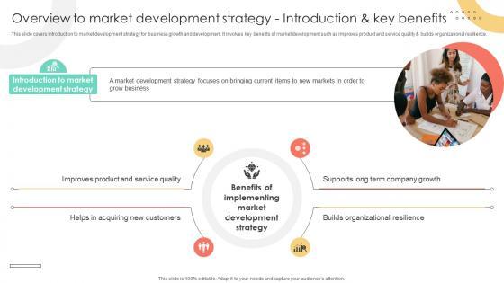 This slide covers introduction to market development strategy for business growth and development. It involves key benefits of market development such as improves product and service quality and builds organizational resilience. The Brand Extension Techniques Overview To Market Development Strategy Introduction Strategy SS V is a compilation of the most recent design trends as a series of slides. It is suitable for any subject or industry presentation, containing attractive visuals and photo spots for businesses to clearly express their messages. This template contains a variety of slides for the user to input data, such as structures to contrast two elements, bullet points, and slides for written information. Slidegeeks is prepared to create an impression. This slide covers introduction to market development strategy for business growth and development. It involves key benefits of market development such as improves product and service quality and builds organizational resilience.