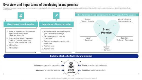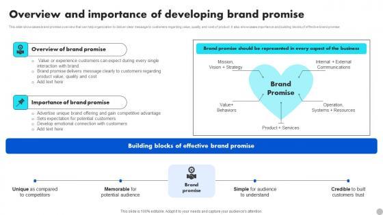 This slide showcases brand promise overview that can help organization to deliver clear message to customers regarding value, quality and cost of product. It also showcases importance and building blocks of effective brand promise. Make sure to capture your audiences attention in your business displays with our gratis customizable Brand Marketing Strategy Overview And Importance Of Developing Brand Promise Slides PDF. These are great for business strategies, office conferences, capital raising or task suggestions. If you desire to acquire more customers for your tech business and ensure they stay satisfied, create your own sales presentation with these plain slides.