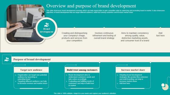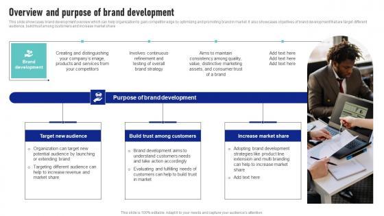 This slide showcases brand development overview which can help organization to gain competitor edge by optimizing and promoting brand in market. It also showcases objectives of brand development that are target different audience, build trust among customers and increase market share Boost your pitch with our creative Overview And Purpose Of Brand Development Launching New Product Brand Pictures Pdf Deliver an awe-inspiring pitch that will mesmerize everyone. Using these presentation templates you will surely catch everyones attention. You can browse the ppts collection on our website. We have researchers who are experts at creating the right content for the templates. So you do not have to invest time in any additional work. Just grab the template now and use them. This slide showcases brand development overview which can help organization to gain competitor edge by optimizing and promoting brand in market. It also showcases objectives of brand development that are target different audience, build trust among customers and increase market share