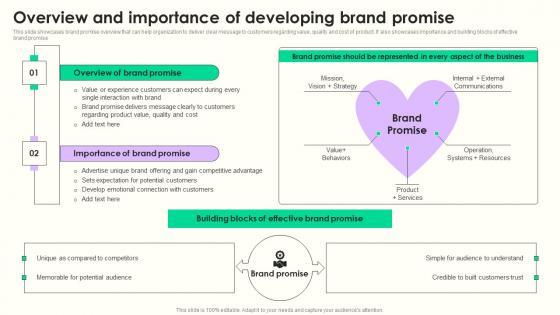 This slide showcases brand promise overview that can help organization to deliver clear message to customers regarding value, quality and cost of product. It also showcases importance and building blocks of effective brand promise. Retrieve professionally designed Overview And Importance Of Developing Brand Promise Rules PDF to effectively convey your message and captivate your listeners. Save time by selecting pre made slideshows that are appropriate for various topics, from business to educational purposes. These themes come in many different styles, from creative to corporate, and all of them are easily adjustable and can be edited quickly. Access them as PowerPoint templates or as Google Slides themes. You do not have to go on a hunt for the perfect presentation because Slidegeeks got you covered from everywhere.