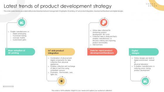 This slide covers trends associated with product development and management. It highlights 3D printing, IoT aid product integration, development feedback and digital designs. Coming up with a presentation necessitates that the majority of the effort goes into the content and the message you intend to convey. The visuals of a PowerPoint presentation can only be effective if it supplements and supports the story that is being told. Keeping this in mind our experts created Brand Extension Techniques Latest Trends Of Product Development Strategy SS V to reduce the time that goes into designing the presentation. This way, you can concentrate on the message while our designers take care of providing you with the right template for the situation. This slide covers trends associated with product development and management. It highlights 3D printing, IoT aid product integration, development feedback and digital designs.