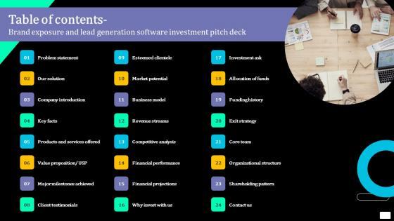This Table Of Contents Brand Exposure And Lead Generation Software Investment Pitch Deck Sample Pdf is perfect for any presentation, be it in front of clients or colleagues. It is a versatile and stylish solution for organizing your meetings. The Table Of Contents Brand Exposure And Lead Generation Software Investment Pitch Deck Sample Pdf features a modern design for your presentation meetings. The adjustable and customizable slides provide unlimited possibilities for acing up your presentation. Slidegeeks has done all the homework before launching the product for you. So, do not wait, grab the presentation templates today Our Table Of Contents Brand Exposure And Lead Generation Software Investment Pitch Deck Sample Pdf are topically designed to provide an attractive backdrop to any subject. Use them to look like a presentation pro.