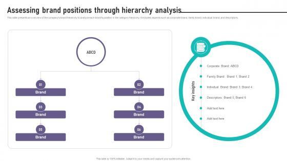 This slide presents an overview of the companys brand hierarchy to analyze each brands position in the category hierarchy. It includes aspects such as corporate brand, family brand, individual brand, and descriptors. Do you know about Slidesgeeks Optimizing Brand Equity Through Strategic Management Assessing Brand Positions Through Hierarchy Analysis Download PDF These are perfect for delivering any kind od presentation. Using it, create PowerPoint presentations that communicate your ideas and engage audiences. Save time and effort by using our pre-designed presentation templates that are perfect for a wide range of topic. Our vast selection of designs covers a range of styles, from creative to business, and are all highly customizable and easy to edit. Download as a PowerPoint template or use them as Google Slides themes.