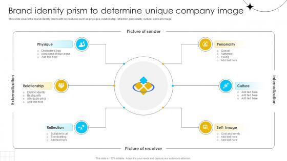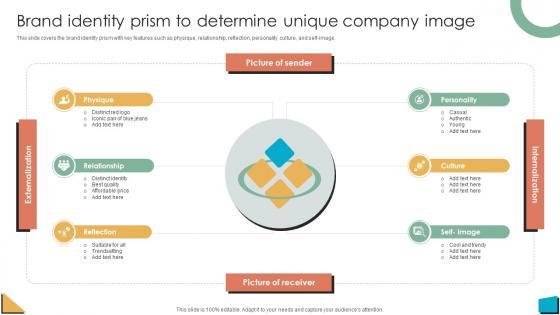 This slide covers the brand identity prism with key features such as physique, relationship, reflection, personality, culture, and self-image. This Brand Identity Prism To Determine Unique Company Image Mockup PDF from Slidegeeks makes it easy to present information on your topic with precision. It provides customization options, so you can make changes to the colors, design, graphics, or any other component to create a unique layout. It is also available for immediate download, so you can begin using it right away. Slidegeeks has done good research to ensure that you have everything you need to make your presentation stand out. Make a name out there for a brilliant performance.