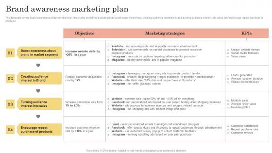 This template covers brand awareness and promotion plan. It includes objectives and strategies to boost brand awareness, creating audience interest in brand, turning audience interest into sales, and encourage repeat purchase of products. Get a simple yet stunning designed Brand Kickoff Promotional Plan Brand Awareness Marketing Plan Professional Pdf. It is the best one to establish the tone in your meetings. It is an excellent way to make your presentations highly effective. So, download this PPT today from Slidegeeks and see the positive impacts. Our easy-to-edit Brand Kickoff Promotional Plan Brand Awareness Marketing Plan Professional Pdf can be your go-to option for all upcoming conferences and meetings. So, what are you waiting for Grab this template today. This template covers brand awareness and promotion plan. It includes objectives and strategies to boost brand awareness, creating audience interest in brand, turning audience interest into sales, and encourage repeat purchase of products.