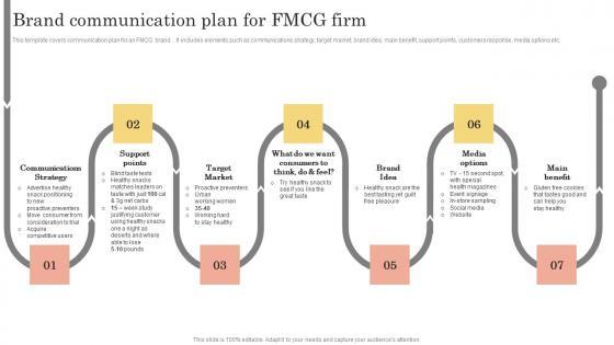 This template covers communication plan for an FMCG brand. . It includes elements such as communications strategy, target market, brand idea, main benefit, support points, customers response, media options etc. Present like a pro with Brand Kickoff Promotional Plan Brand Communication Plan For FMCG Firm Microsoft Pdf Create beautiful presentations together with your team, using our easy-to-use presentation slides. Share your ideas in real-time and make changes on the fly by downloading our templates. So whether you are in the office, on the go, or in a remote location, you can stay in sync with your team and present your ideas with confidence. With Slidegeeks presentation got a whole lot easier. Grab these presentations today. This template covers communication plan for an FMCG brand. . It includes elements such as communications strategy, target market, brand idea, main benefit, support points, customers response, media options etc.