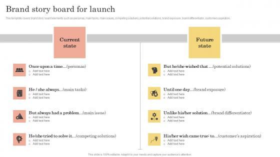 This template covers brand story board elements such as personas, main tasks, main issues, competing solutions, potential solutions, brand exposure, brand differentiator, customers aspiration. Make sure to capture your audiences attention in your business displays with our gratis customizable Brand Kickoff Promotional Plan Brand Story Board For Launch Download Pdf. These are great for business strategies, office conferences, capital raising or task suggestions. If you desire to acquire more customers for your tech business and ensure they stay satisfied, create your own sales presentation with these plain slides. This template covers brand story board elements such as personas, main tasks, main issues, competing solutions, potential solutions, brand exposure, brand differentiator, customers aspiration.