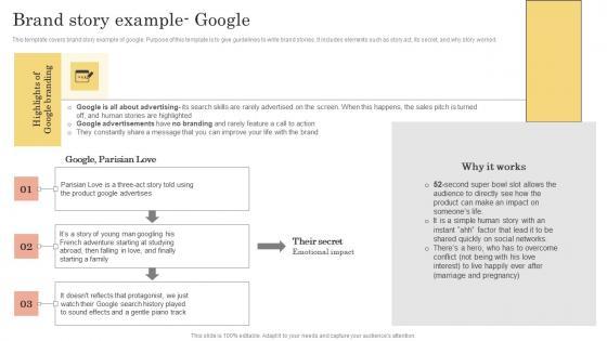 This template covers brand story example of google. Purpose of this template is to give guidelines to write brand stories. It includes elements such as story act, its secret, and why story worked. Formulating a presentation can take up a lot of effort and time, so the content and message should always be the primary focus. The visuals of the PowerPoint can enhance the presenters message, so our Brand Kickoff Promotional Plan Brand Story Example Google Formats Pdf was created to help save time. Instead of worrying about the design, the presenter can concentrate on the message while our designers work on creating the ideal templates for whatever situation is needed. Slidegeeks has experts for everything from amazing designs to valuable content, we have put everything into Brand Kickoff Promotional Plan Brand Story Example Google Formats Pdf. This template covers brand story example of google. Purpose of this template is to give guidelines to write brand stories. It includes elements such as story act, its secret, and why story worked.