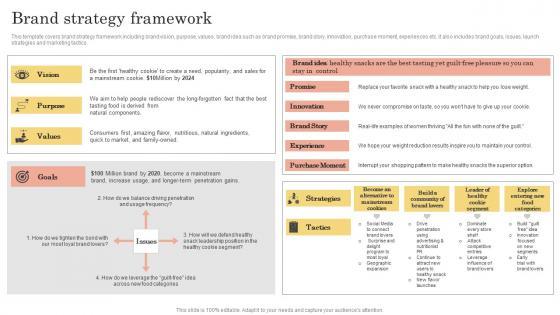 This template covers brand strategy framework including brand vision, purpose, values, brand idea such as brand promise, brand story, innovation, purchase moment, experiences etc. it also includes brand goals, issues, launch strategies and marketing tactics. This modern and well-arranged Brand Kickoff Promotional Plan Brand Strategy Framework Structure Pdf provides lots of creative possibilities. It is very simple to customize and edit with the Powerpoint Software. Just drag and drop your pictures into the shapes. All facets of this template can be edited with Powerpoint no extra software is necessary. Add your own material, put your images in the places assigned for them, adjust the colors, and then you can show your slides to the world, with an animated slide included. This template covers brand strategy framework including brand vision, purpose, values, brand idea such as brand promise, brand story, innovation, purchase moment, experiences etc. it also includes brand goals, issues, launch strategies and marketing tactics.