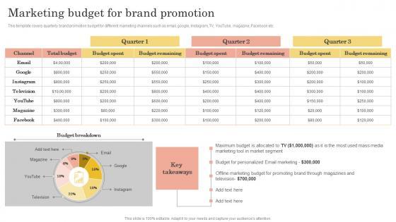 This template covers quarterly brand promotion budget for different marketing channels such as email, google, Instagram, TV, YouTube, magazine, Facebook etc. Find a pre-designed and impeccable Brand Kickoff Promotional Plan Marketing Budget For Brand Promotion Download Pdf. The templates can ace your presentation without additional effort. You can download these easy-to-edit presentation templates to make your presentation stand out from others. So, what are you waiting for Download the template from Slidegeeks today and give a unique touch to your presentation. This template covers quarterly brand promotion budget for different marketing channels such as email, google, Instagram, TV, YouTube, magazine, Facebook etc.