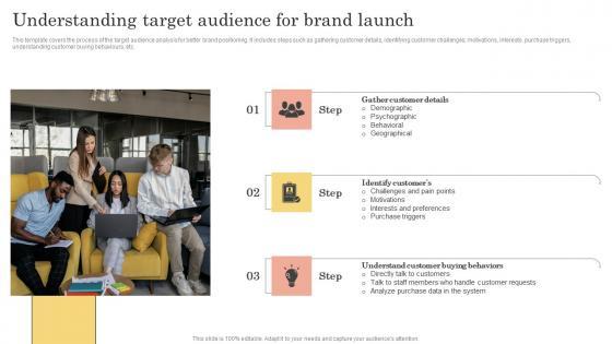 This template covers the process of the target audience analysis for better brand positioning. It includes steps such as gathering customer details, identifying customer challenges, motivations, interests, purchase triggers, understanding customer buying behaviours, etc. Do you have an important presentation coming up Are you looking for something that will make your presentation stand out from the rest Look no further than Brand Kickoff Promotional Plan Understanding Target Audience For Brand Launch Ideas Pdf. With our professional designs, you can trust that your presentation will pop and make delivering it a smooth process. And with Slidegeeks, you can trust that your presentation will be unique and memorable. So why wait Grab Brand Kickoff Promotional Plan Understanding Target Audience For Brand Launch Ideas Pdf today and make your presentation stand out from the rest. This template covers the process of the target audience analysis for better brand positioning. It includes steps such as gathering customer details, identifying customer challenges, motivations, interests, purchase triggers, understanding customer buying behaviours, etc.