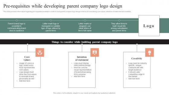 This slide provides information regarding pre-requisites essential in order to build parent company logo design in terms of considering core values, intention of statement and creativity. Presenting this PowerPoint presentation, titled Pre Requisites While Developing Parent Company Logo Design Effective Brand Maintenance Graphics Pdf with topics curated by our researchers after extensive research. This editable presentation is available for immediate download and provides attractive features when used. Download now and captivate your audience. Presenting this Pre Requisites While Developing Parent Company Logo Design Effective Brand Maintenance Graphics Pdf Our researchers have carefully researched and created these slides with all aspects taken into consideration. This is a completely customizable Pre Requisites While Developing Parent Company Logo Design Effective Brand Maintenance Graphics Pdf that is available for immediate downloading. Download now and make an impact on your audience. Highlight the attractive features available with our PPTs. This slide provides information regarding pre-requisites essential in order to build parent company logo design in terms of considering core values, intention of statement and creativity.