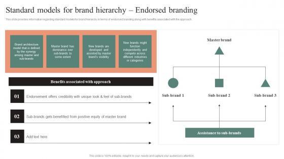 This slide provides information regarding standard models for brand hierarchy in terms of endorsed branding along with benefits associated with the approach. Slidegeeks is one of the best resources for PowerPoint templates. You can download easily and regulate Standard Models For Brand Hierarchy Endorsed Branding Effective Brand Maintenance Portrait Pdf for your personal presentations from our wonderful collection. A few clicks is all it takes to discover and get the most relevant and appropriate templates. Use our Templates to add a unique zing and appeal to your presentation and meetings. All the slides are easy to edit and you can use them even for advertisement purposes. This slide provides information regarding standard models for brand hierarchy in terms of endorsed branding along with benefits associated with the approach.