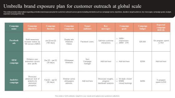 This slide provides information regarding umbrella brand exposure plan for customer outreach across globe including elements such as campaign name, objectives, duration, target audience, key messages, campaign goals, budget, expected campaign ROI, etc. Present like a pro with Umbrella Brand Exposure Plan For Customer Outreach Effective Brand Maintenance Microsoft Pdf Create beautiful presentations together with your team, using our easy-to-use presentation slides. Share your ideas in real-time and make changes on the fly by downloading our templates. So whether you are in the office, on the go, or in a remote location, you can stay in sync with your team and present your ideas with confidence. With Slidegeeks presentation got a whole lot easier. Grab these presentations today. This slide provides information regarding umbrella brand exposure plan for customer outreach across globe including elements such as campaign name, objectives, duration, target audience, key messages, campaign goals, budget, expected campaign ROI, etc.