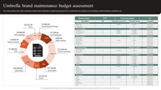 This slide provides information regarding umbrella brand maintenance budget assessment in terms of international marketing, local marketing, content marketing, advertising, etc. Slidegeeks is here to make your presentations a breeze with Umbrella Brand Maintenance Budget Assessment Effective Brand Maintenance Introduction Pdf With our easy-to-use and customizable templates, you can focus on delivering your ideas rather than worrying about formatting. With a variety of designs to choose from, you are sure to find one that suits your needs. And with animations and unique photos, illustrations, and fonts, you can make your presentation pop. So whether you are giving a sales pitch or presenting to the board, make sure to check out Slidegeeks first. This slide provides information regarding umbrella brand maintenance budget assessment in terms of international marketing, local marketing, content marketing, advertising, etc.