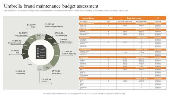 This slide provides information regarding umbrella brand maintenance budget assessment in terms of international marketing, local marketing, content marketing, advertising, etc. Do you have an important presentation coming up Are you looking for something that will make your presentation stand out from the rest Look no further than Umbrella Brand Maintenance Budget Assessment Leveraging Corporate Themes Pdf With our professional designs, you can trust that your presentation will pop and make delivering it a smooth process. And with Slidegeeks, you can trust that your presentation will be unique and memorable. So why wait Grab Umbrella Brand Maintenance Budget Assessment Leveraging Corporate Themes Pdf today and make your presentation stand out from the rest. This slide provides information regarding umbrella brand maintenance budget assessment in terms of international marketing, local marketing, content marketing, advertising, etc.