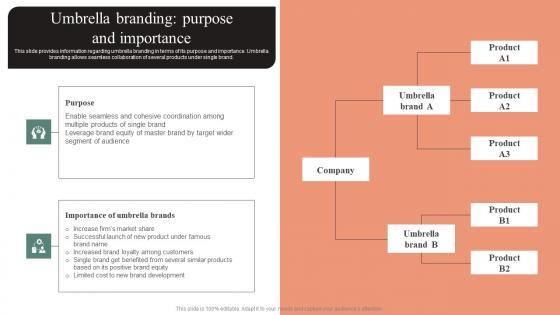 This slide provides information regarding umbrella branding in terms of its purpose and importance. Umbrella branding allows seamless collaboration of several products under single brand. Do you have an important presentation coming up Are you looking for something that will make your presentation stand out from the rest Look no further than Umbrella Branding Purpose And Importance Effective Brand Maintenance Slides Pdf With our professional designs, you can trust that your presentation will pop and make delivering it a smooth process. And with Slidegeeks, you can trust that your presentation will be unique and memorable. So why wait Grab Umbrella Branding Purpose And Importance Effective Brand Maintenance Slides Pdf today and make your presentation stand out from the rest. This slide provides information regarding umbrella branding in terms of its purpose and importance. Umbrella branding allows seamless collaboration of several products under single brand.