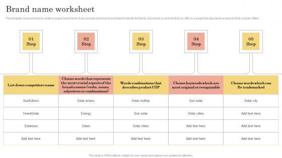This template covers process to create a unique brand name. It also include brand name worksheet to identify the family of products or services that you offer or a single line of products or services that company offers.If your project calls for a presentation, then Slidegeeks is your go-to partner because we have professionally designed, easy-to-edit templates that are perfect for any presentation. After downloading, you can easily edit Brand Name Worksheet Brand Introduction Plan Rules PDF and make the changes accordingly. You can rearrange slides or fill them with different images. Check out all the handy templates