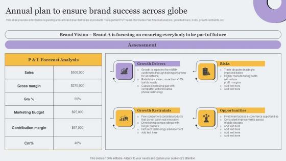 This slide provides information regarding annual brand plan that helps in products management YoY basis. It includes P and L forecast analysis, growth drivers, risks, growth restraints, etc. Slidegeeks is one of the best resources for PowerPoint templates. You can download easily and regulate Strengthen Customer Relation Annual Plan To Ensure Brand Success Across Globe Infographics PDF for your personal presentations from our wonderful collection. A few clicks is all it takes to discover and get the most relevant and appropriate templates. Use our Templates to add a unique zing and appeal to your presentation and meetings. All the slides are easy to edit and you can use them even for advertisement purposes.