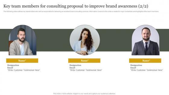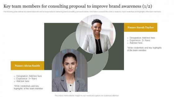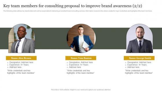 The following slide outlines key stakeholders who will be responsible for delivering brand consulting services to clients. Information covered in this slide is related to major credentials and highlights of the team members. Elevate your presentations with our intuitive Brand Presence Enhancement Consulting Key Team Members For Consulting Proposal Download Pdf template. Whether you are delivering a pitch, sharing data, or presenting ideas, our visually-stunning single-slide PPT template is the perfect tool to captivate your audience. With 100 percent editable features and a user-friendly interface, creating professional presentations has never been easier. Download now and leave a lasting impression. The following slide outlines key stakeholders who will be responsible for delivering brand consulting services to clients. Information covered in this slide is related to major credentials and highlights of the team members.