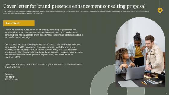 The following slide outlines a comprehensive cover letter for brand strategy consulting proposal. Cover letter can assist corporates in successfully pitching the offerings or services to clients and showcase why the brand consulting firm stands out from market leaders. Stand out from the crowd with our dynamic Cover Letter For Brand Presence Enhancement Consulting Proposal Background Pdf template. Designed to help you make a statement, this single-slide PPT template is fully customizable to suit your unique needs. With eye-catching visuals and seamless editing options, you can create impactful presentations in minutes. Say goodbye to boring slides and unlock your presentation potential with our top-notch template. The following slide outlines a comprehensive cover letter for brand strategy consulting proposal. Cover letter can assist corporates in successfully pitching the offerings or services to clients and showcase why the brand consulting firm stands out from market leaders.