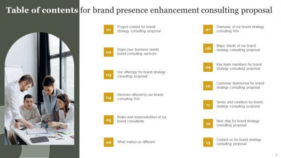 Power up your presentations with our Table Of Contents For Brand Presence Enhancement Consulting Proposal Download Pdf single-slide PPT template. Our visually-stunning template will help you deliver your message with confidence. With easy-to-use editing options and fully customizable features, you can create polished and captivating presentations in no time. Say goodbye to boring slides and hello to impactful presentations with our top-quality template. Download now and get ready to wow your audience. singles Our Table Of Contents For Brand Presence Enhancement Consulting Proposal Download Pdf are topically designed to provide an attractive backdrop to any subject. Use them to look like a presentation pro.