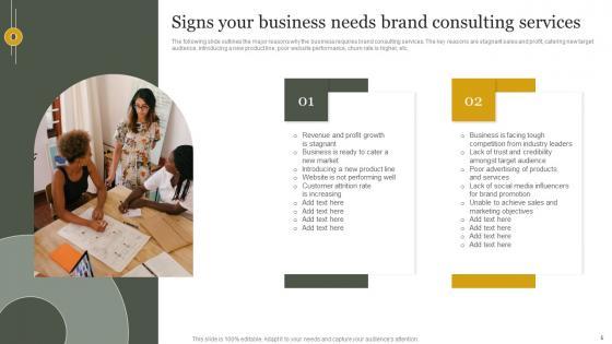 The following slide outlines the major reasons why the business requires brand consulting services. The key reasons are stagnant sales and profit, catering new target audience, introducing a new product line, poor website performance, churn rate is higher, etc. Unleash your creativity with our Brand Presence Enhancement Consulting Signs Your Business Needs Brand Consulting Themes Pdf single-slide PPT template. Whether you are a seasoned presenter or a newbie, our editable and visually-stunning template will make your presentations shine. This template is versatile and easy to use. Make your presentations unforgettable with our premium template and leave a lasting impression on your audience. The following slide outlines the major reasons why the business requires brand consulting services. The key reasons are stagnant sales and profit, catering new target audience, introducing a new product line, poor website performance, churn rate is higher, etc.