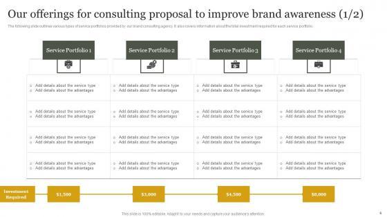The following slide outlines various types of service portfolios provided by our brand consulting agency. It also covers information about the total investment required for each service portfolio. Take your presentations to the next level with our Brand Presence Enhancement Consulting Our Offerings For Consulting Proposal To Improve Themes Pdf template. With its sleek design and seamless editing features, this single-slide PPT template is a game-changer for professionals who want to make an impact. Impress your audience with stunning visuals and engaging content that will capture their attention from start to finish. Get your hands on our template and elevate your presentations to new heights. The following slide outlines various types of service portfolios provided by our brand consulting agency. It also covers information about the total investment required for each service portfolio.