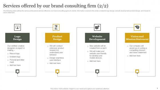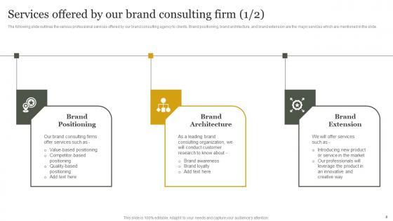 The following slide outlines the various professional services offered by our brand consulting agency to clients. Brand positioning, brand architecture, and brand extension are the major services which are mentioned in the slide. Stand out from the crowd with our dynamic Brand Presence Enhancement Consulting Services Offered By Our Brand Consulting Graphics Pdf template. Designed to help you make a statement, this single-slide PPT template is fully customizable to suit your unique needs. With eye-catching visuals and seamless editing options, you can create impactful presentations in minutes. Say goodbye to boring slides and unlock your presentation potential with our top-notch template. The following slide outlines the various professional services offered by our brand consulting agency to clients. Brand positioning, brand architecture, and brand extension are the major services which are mentioned in the slide.