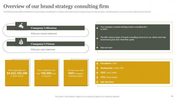 The following slide outlines introduction to brand strategy consulting firm. It contains information about company background, top executives, marketing agency mission and vision statement, and key facts. Power up your presentations with our Brand Presence Enhancement Consulting Overview Of Our Brand Strategy Consulting Information Pdf single-slide PPT template. Our visually-stunning template will help you deliver your message with confidence. With easy-to-use editing options and fully customizable features, you can create polished and captivating presentations in no time. Say goodbye to boring slides and hello to impactful presentations with our top-quality template. Download now and get ready to wow your audience. singles The following slide outlines introduction to brand strategy consulting firm. It contains information about company background, top executives, marketing agency mission and vision statement, and key facts.