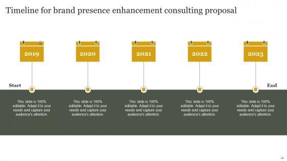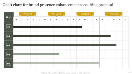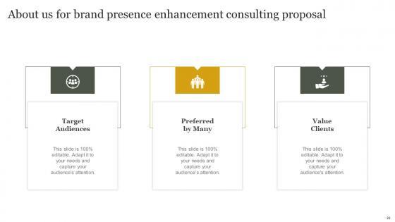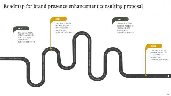 Transform your proposals into masterpieces with our Brand Presence Enhancement Consulting Proposal Ppt Powerpoint Presentation Complete Deck With Slides. Our 100 percent editable Template features visually-stunning designs that are sure to impress. With easy-to-use features and customizable elements, you can create unique proposals that meet your specific needs. Whether you are creating a business proposal or a corporate proposal, our Template is the perfect tool to help you succeed. Our Brand Presence Enhancement Consulting Proposal Ppt Powerpoint Presentation Complete Deck With Slides are topically designed to provide an attractive backdrop to any subject. Use them to look like a presentation pro.