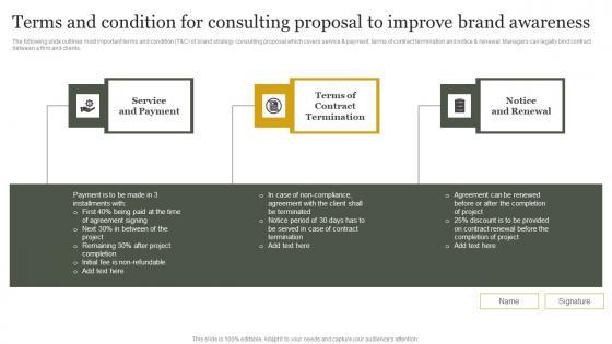 The following slide outlines most important terms and condition T and C of brand strategy consulting proposal which covers service and payment, terms of contract termination and notice and renewal. Managers can legally bind contract between a firm and clients. Take your presentations to the next level with our Brand Presence Enhancement Consulting Terms And Condition For Consulting Proposal Microsoft Pdf template. With its sleek design and seamless editing features, this single-slide PPT template is a game-changer for professionals who want to make an impact. Impress your audience with stunning visuals and engaging content that will capture their attention from start to finish. Get your hands on our template and elevate your presentations to new heights. The following slide outlines most important terms and condition T and C of brand strategy consulting proposal which covers service and payment, terms of contract termination and notice and renewal. Managers can legally bind contract between a firm and clients.