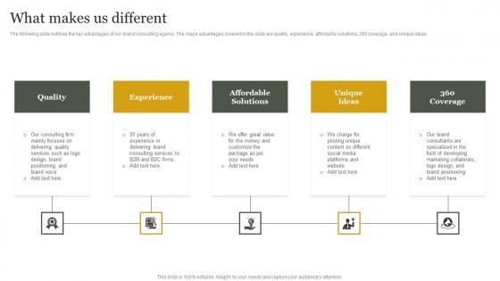 The following slide outlines the key advantages of our brand consulting agency. The major advantages covered in the slide are quality, experience, affordable solutions, 360 coverage, and unique ideas. Power up your presentations with our Brand Presence Enhancement Consulting What Makes Us Different Ideas Pdf single-slide PPT template. Our visually-stunning template will help you deliver your message with confidence. With easy-to-use editing options and fully customizable features, you can create polished and captivating presentations in no time. Say goodbye to boring slides and hello to impactful presentations with our top-quality template. Download now and get ready to wow your audience. singles The following slide outlines the key advantages of our brand consulting agency. The major advantages covered in the slide are quality, experience, affordable solutions, 360 coverage, and unique ideas.