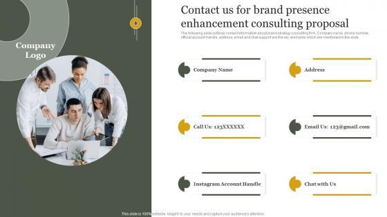 The following slide outlines contact information about brand strategy consulting firm. Company name, phone number, official account handle, address, email and chat support are the key elements which are mentioned in the slide. Elevate your presentations with our intuitive Contact Us For Brand Presence Enhancement Consulting Proposal Topics Pdf template. Whether you are delivering a pitch, sharing data, or presenting ideas, our visually-stunning single-slide PPT template is the perfect tool to captivate your audience. With 100 percent editable features and a user-friendly interface, creating professional presentations has never been easier. Download now and leave a lasting impression. The following slide outlines contact information about brand strategy consulting firm. Company name, phone number, official account handle, address, email and chat support are the key elements which are mentioned in the slide.