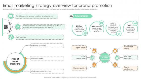 Mentioned slide provides information about email marketing strategy concept. It includes key elements such as description, benefits, limitations, and key statistics.Here you can discover an assortment of the finest PowerPoint and Google Slides templates. With these templates, you can create presentations for a variety of purposes while simultaneously providing your audience with an eye-catching visual experience. Download Email Marketing Strategy Overview For Brand Promotion Comprehensive Guide For Marketing Technology to deliver an impeccable presentation. These templates will make your job of preparing presentations much quicker, yet still, maintain a high level of quality. Slidegeeks has experienced researchers who prepare these templates and write high-quality content for you. Later on, you can personalize the content by editing the Email Marketing Strategy Overview For Brand Promotion Comprehensive Guide For Marketing Technology. Mentioned slide provides information about email marketing strategy concept. It includes key elements such as description, benefits, limitations, and key statistics.