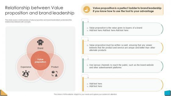 This slide covers a brief overview of value proposition and brand leadership to understand the relationship between both concepts. Retrieve professionally designed Brand Authority Relationship Between Value Proposition And Brand Leadership Strategy SS V to effectively convey your message and captivate your listeners. Save time by selecting pre-made slideshows that are appropriate for various topics, from business to educational purposes. These themes come in many different styles, from creative to corporate, and all of them are easily adjustable and can be edited quickly. Access them as PowerPoint templates or as Google Slides themes. You do not have to go on a hunt for the perfect presentation because Slidegeeks got you covered from everywhere. This slide covers a brief overview of value proposition and brand leadership to understand the relationship between both concepts.